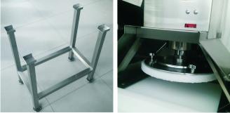 stolik wykonany ze stali nierdzewnej z ogranicznikami uniemożliwiającymi jakikolwiek niepowołany ruch urządzenia oraz antypoślizgowe nóżki z gumowymi podkładkami.
