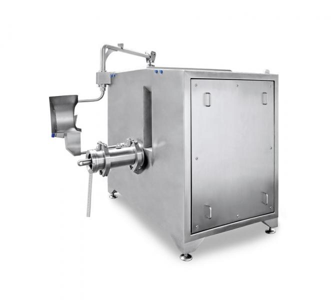 Wilki z podajnikiem PSS SGS to kompaktowe urządzenie zaprojektowane do szybkiego i idealnego mielenia świeżego mięsa i innych produktów spożywczych. PSS SGS pozwalają na grube i bardzo drobne mielenie, zapewniając najwyższą jakość i konsystencję produktu końcowego. Świeże mięso, przygotowane do procesu mielenia, zostaje załadowane do komory PSS SGS wyposażonej w mieszalnik podający. Jego główną funkcją jest szybkie przesuwanie mielonego produktu w kierunku ślimaka tłoczącego i zestawu tnącego. Struktura wsadu po zmieleniu jest zależna od użytego zestawu tnącego. Ramię podajnika obraca się powoli, przesuwając stale jednakową ilość wsadu. Dzięki zastosowaniu takiego systemu, wyeliminowano gromadzenie się zbyt dużej ilości produktu w jednym miejscu, zwiększając przy tym wydajność.